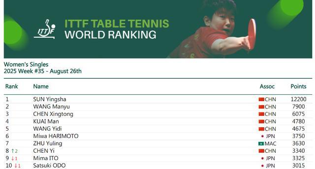 孙颖莎与队友王曼昱、陈幸同、蒯曼、王艺迪位列女单世界前五。日本选手张本美和、中国澳门队朱雨玲分列第六和第七。凭借在欧洲大满贯赛瑞典站闯入四强的表现,另一位国乒队员陈熠排名上升两位,位列第八,刷新个人职业生涯排名新高。日本选手伊藤美诚和大藤沙月分列第九和第十。