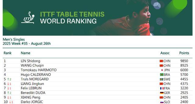 男单方面,国乒选手林诗栋和王楚钦占据前两位,身后是日本选手张本智和以及巴西运动员卡尔德拉诺。欧洲大满贯赛瑞典站冠军莫雷加德排名升至第五。排名第六至第十的分别是梁靖崑(中国)、费利克斯·勒布伦(法国)、杜达(德国)、向鹏(中国)、约奇克(斯洛文尼亚)。