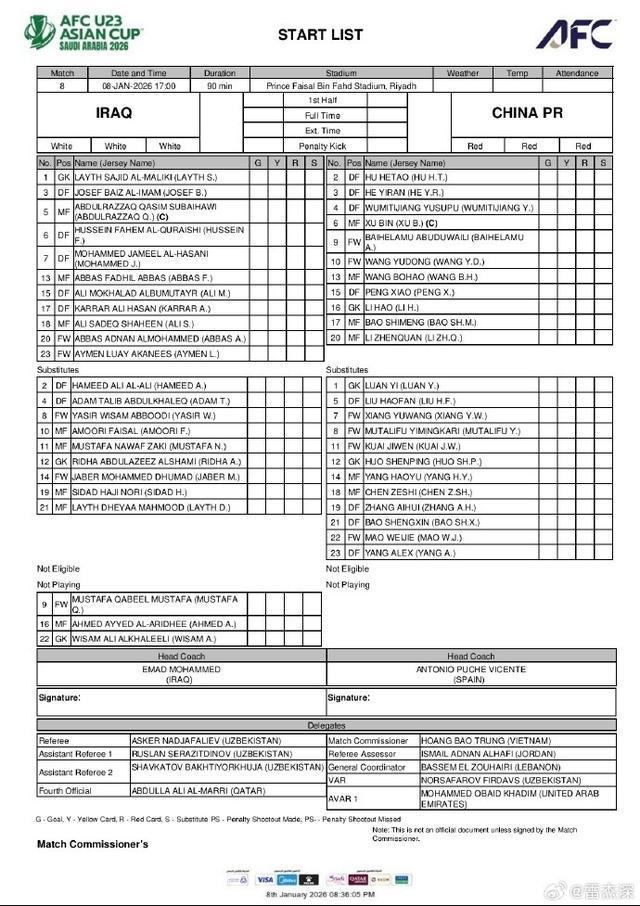 不过,从比赛日公布的官方报名信息来看,伊拉克U23队本场比赛最终仅报20人名单,人员确实未能满额,这也意味着伊拉克主帅此前的说法并非“烟雾弹”,球队确实遭遇了一定程度的减员。