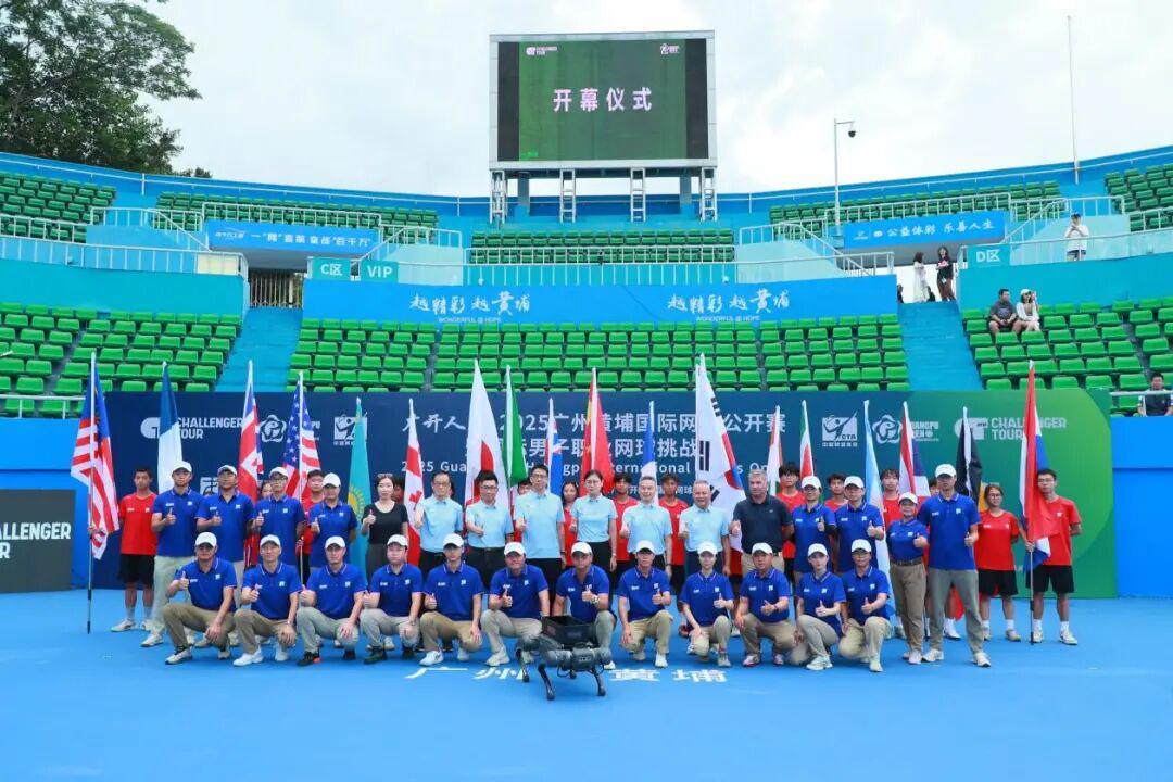 开幕式现场,多方力量携手共绘赛事蓝图,更以创新科技元素点亮仪式,尽显黄埔“体育+ 科技”的独特魅力。随着广州市黄埔区教育(体育)局党组书记、局长彭瑄宣布赛事开幕,并携手广州市体育局竞赛中心主任李春献、广州开发区黄埔区“百千万工程”指挥部办公室常务副主任梁德志、广州开发区人才教育工作集团党委副书记李宗儒、广州黄埔区开发区网球协会会长许鸿生、广东恰好时体育有限公司董事长欧旭亚、中国网球协会赛事监督郎爽、ATP赛事监督Rogerio Santos共同挥拍,为本次赛事开出“首球”,标志着这场国际网球盛宴正式拉开战幕。